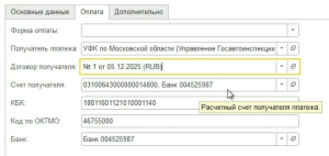 - Получатель платежа, то есть ведомство, которому нужно перечислить деньги: ГИБДД, МАДИ, АМПП. Эти данные подтягиваются из справочника «Контрагенты», где необходимо создать карточку ведомства на основе информации из ГИС ГМП.