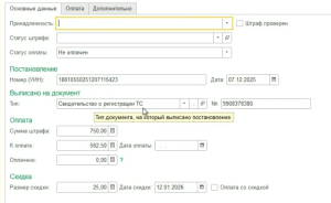 Экономия времени бухгалтерии. Утром бухгалтер открывает 1С, и штрафы уже есть в системе. Все реквизиты заполнены корректно: ИНН ведомства, КБК, сумма, назначение платежа. Остается только сформировать платеж и провести оплату. Модуль учитывает скидку 25% на оплату штрафа, и если она сгорает, сумма к оплате меняется автоматически.