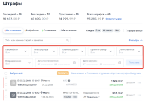 Для штрафов можно выбрать фильтры и посмотреть начисления: